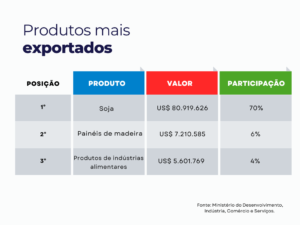 Os países que mais fazem negócios com o município são, respectivamente, a China, Tailândia, Países Baixos (Holanda), México, Colômbia, Peru, Bélgica, Paraguai, Chile e Bolívia, sendo a soja responsável por mais de 70,4%, seguido de madeira, carvão vegetal e obras de madeira, produtos de indústrias alimentares, produtos de plástico e borracha e outros. Somente no mês de março, as exportações chegaram a US$81,7 milhões.
