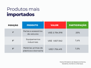 Já nas importações, nos três primeiros meses de 2026, a cidade totalizou US$10,6 milhões (cerca de R$576,15 milhões em reais). Os principais produtos importados são partes de veículos, aparelhos e outros materiais elétricos, e, plásticos e suas obras e máquinas, importando em março, US$3,7 milhões.