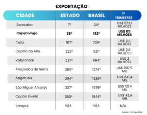 Entre as principais cidades da região, o município fica atrás somente de Sorocaba, que atualmente ocupa a 7ª posição no ranking estadual e 24ª nacional nas exportações.